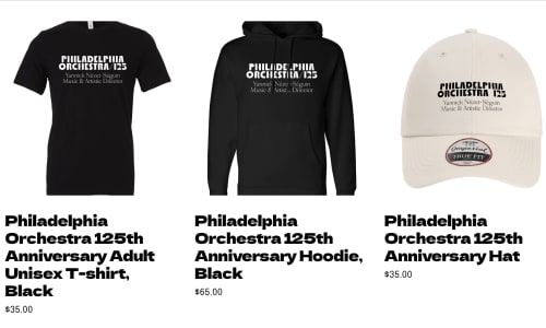 Celebrate your love of The Philadelphia Orchestra with exclusive apparel and souvenirs. From stylish T-shirts and cozy hoodies to mugs and totes, the shop is your destination for keepsakes that celebrate the Orchestra’s 125th anniversary! Shop online anytime or join us during select Orchestra performances at the Kimmel Center—a perfect chance to browse, connect, and take home something unforgettable.