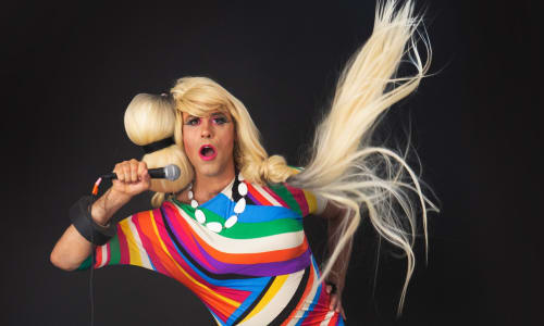 The Martha Graham Cracker Cabaret is an in-your-face rock and roll drag cabaret. Backed by her four-piece band, Martha Graham Cracker performs freaky mashups and funky rearrangements of songs by artists ranging from Nina Simone to Prince, Led Zeppelin to Lana Del Rey, and Pink to Lady Gaga. Styling by Max Brown.